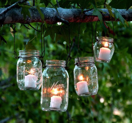 Hanging jars filled with glowing candles can instantly give your garden a cozy, romantic touch. The glass reflects the light beautifully, making the flames look even warmer against the green backdrop.