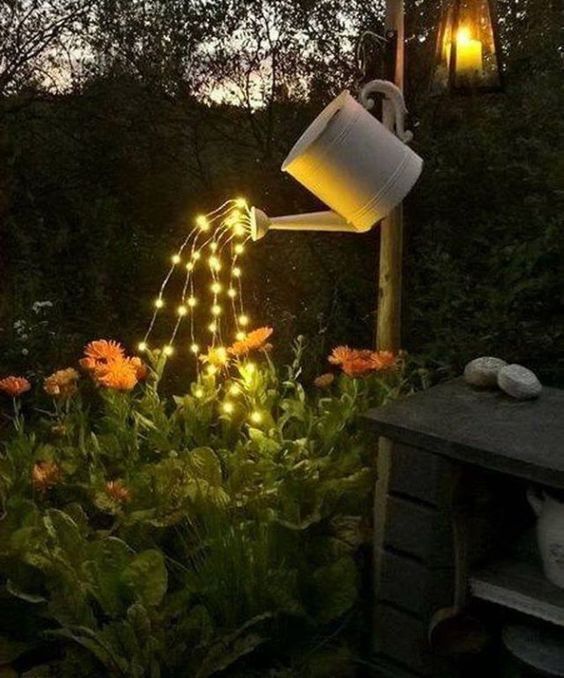 To create it, attach a string of fairy lights inside the spout and let them cascade down like streams of water. Secure the can on a sturdy hook or pole so it stays in place.
