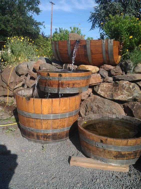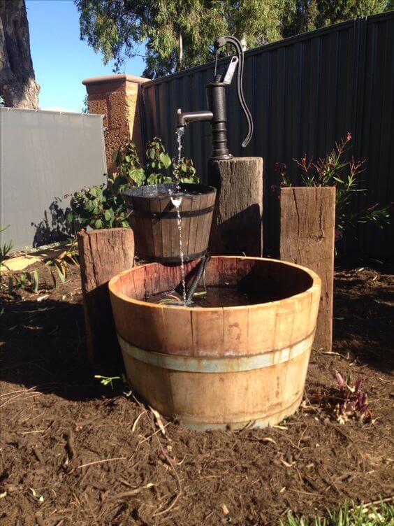 #6 Rustic Water Feature Using An Old Well Pump, Wine Barrel, And Railway Sleepers
