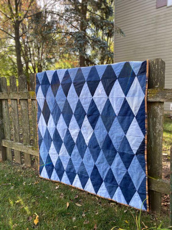 Step 2: Arrange the diamonds in a gradient or checkered pattern before sewing. Play around with light and dark denim to create depth.