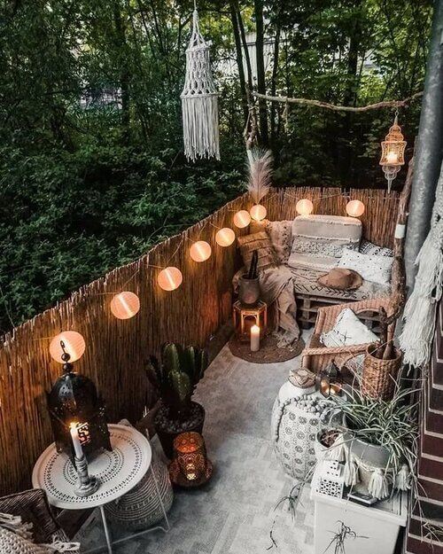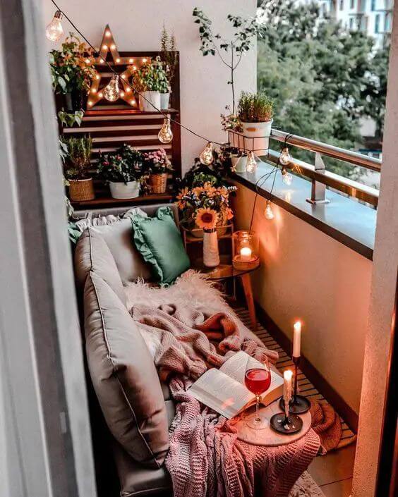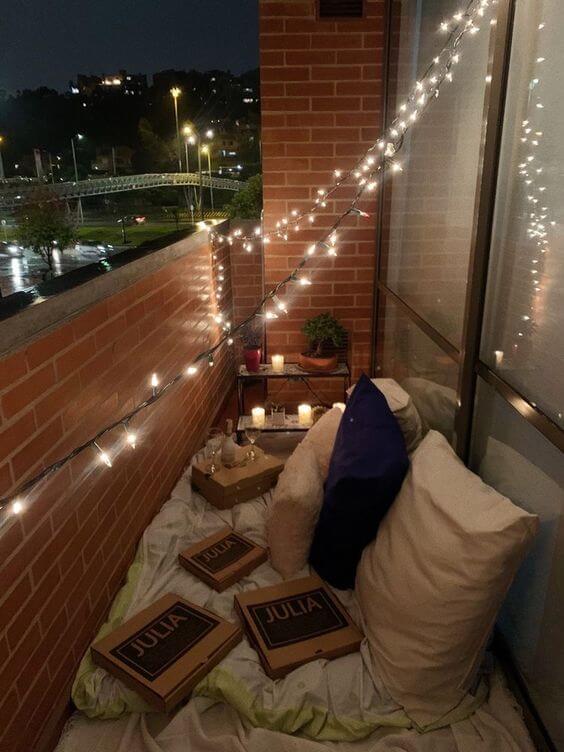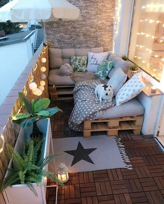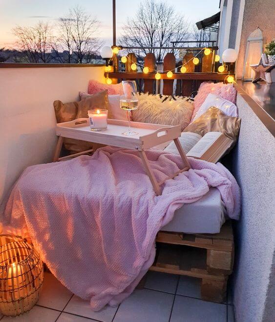 #2 Cozy Balcony Lighting Idea with DIY Pallet Seat