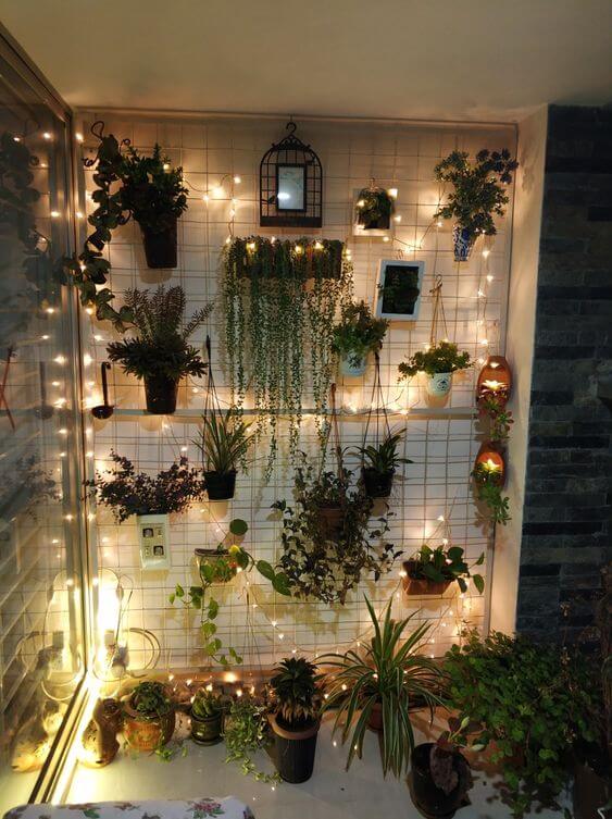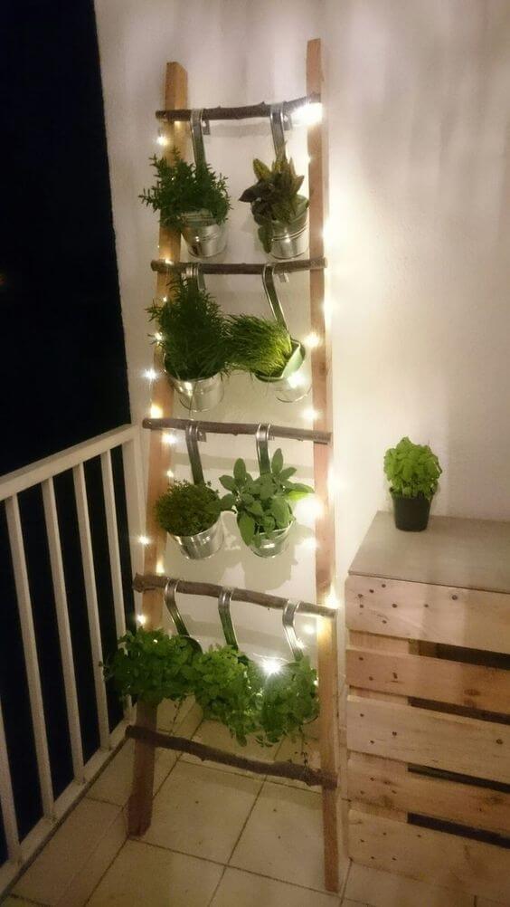 #15 DIY Ladder With String Lights and Plant Pots for Decorating Balcony