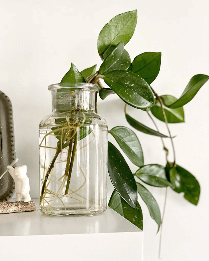 Keep it in indirect light and change the water weekly. Its trailing vines look beautiful cascading over shelves. Hoya blooms make it extra special indoors.