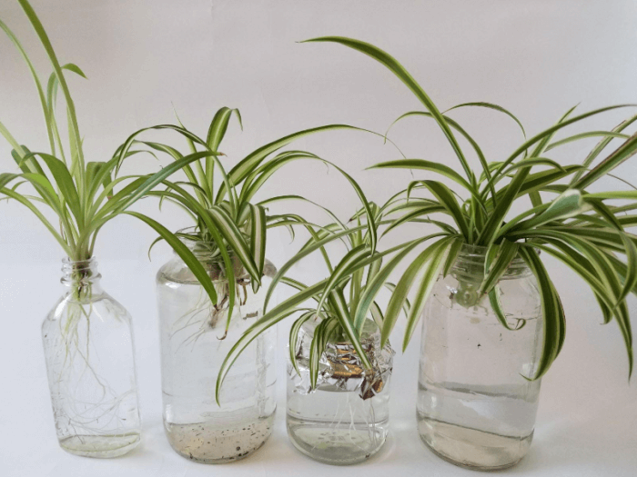 Source: Aloe of the PlantsSpider plants are well-loved for their arching leaves and baby âspiderettes.â Place one of these offshoots in water, and it will root quickly. They look stunning in clear glass containers where roots can be admired.