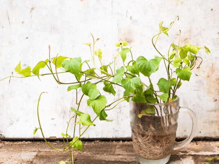 Source: Gardening Know HowSweet potato vines root quickly in water, producing trailing green or purple foliage. Place a tuber in water or use cuttings in a vase. They thrive in sunny spots and grow fast indoors.