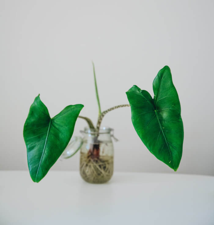 Source: Olle ErikssonAlocasia, also known as Elephant Ear, adapts beautifully to water culture. Its dramatic leaves rise tall above the vase, creating a bold statement. Use a clear container to showcase both roots and stems.