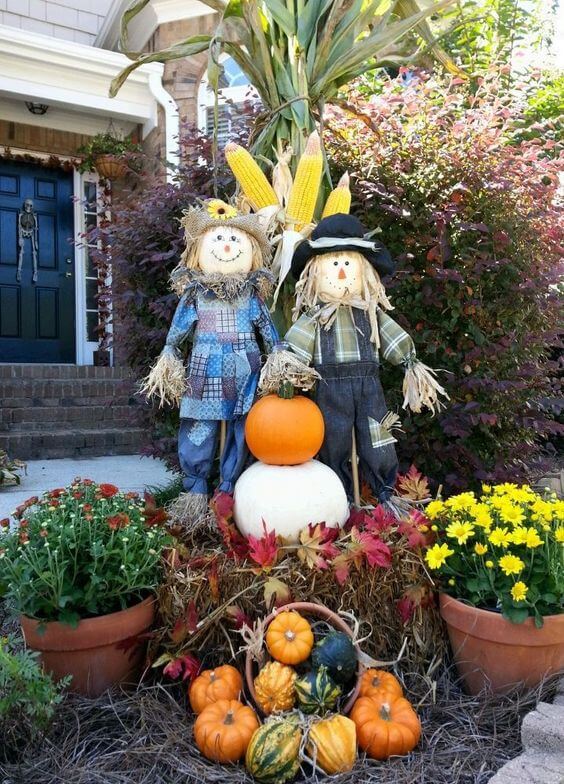 #12 An Outdoor Fall Display Made From Scarecrows, Hay, Cornstalk, Pumpkins, Gourds, And Mums