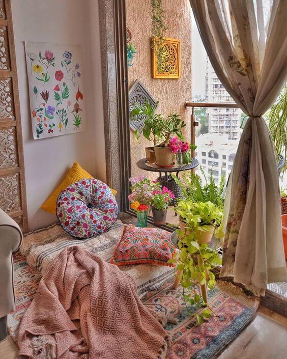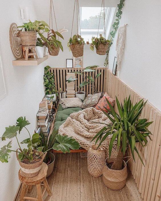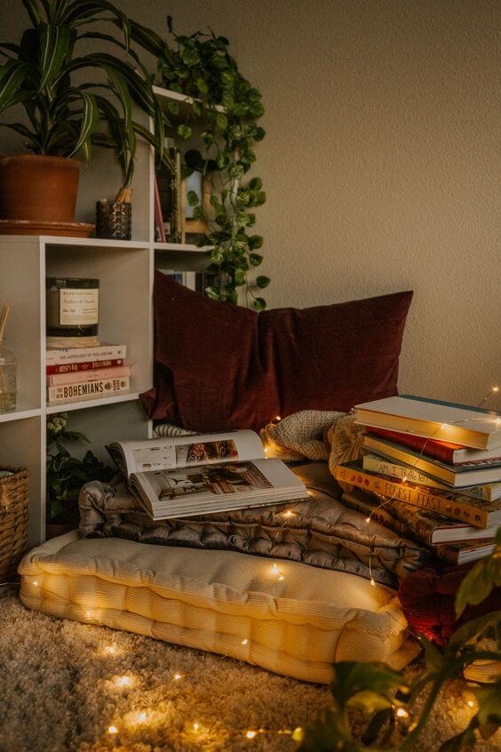 #16 Boho Small Reading Nook with Comfy Pillows and Houseplants