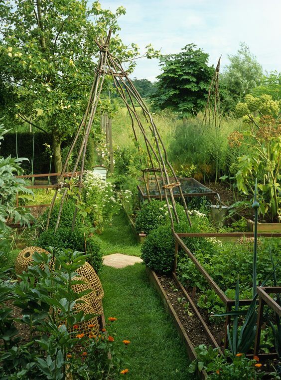 This garden feels like stepping into a charming country retreat, where simple structures bring both beauty and function. The tall twig teepee supports climbing beans and peas, creating a rustic frame that looks natural in the landscape.
