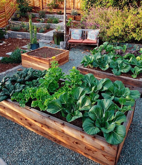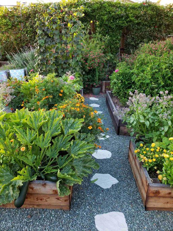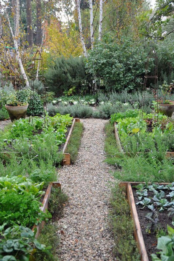 The crushed pathway not only keeps your shoes mud-free but also makes the layout look organized. To recreate this, spread a layer of crushed stone or gravel between beds for easy maintenance.