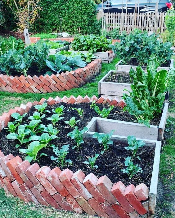 The contrast makes the vegetables pop against the earthy tones of the bricks. You can build this look by reusing old bricks to edge your beds and combining them with simple wooden boxes for variety.