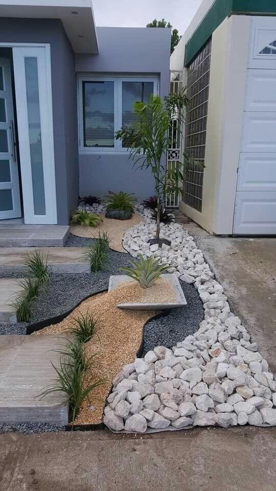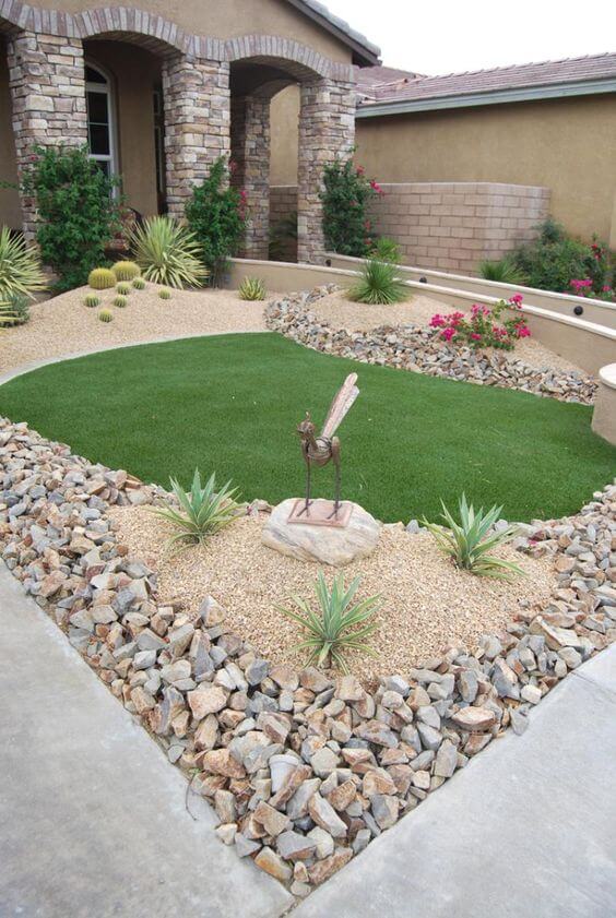 This design proves that a front yard can look stylish while using very little water. The layered mix of gravel, white stones, and sandy textures creates a striking contrast that frames the plants beautifully.