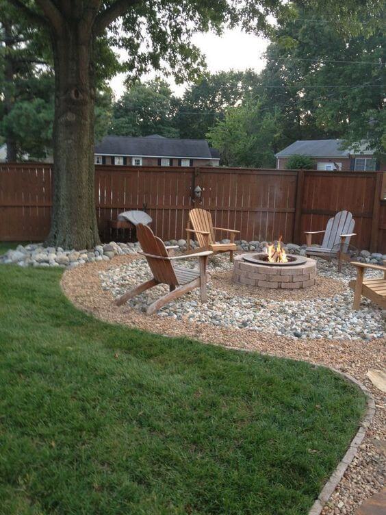 The gravel and pebbles not only create a clean, drought-friendly base but also add rustic charm to the design. To recreate this, choose a flat area, lay down gravel for safety, and stack heat-resistant stones or bricks to form the fire pit.