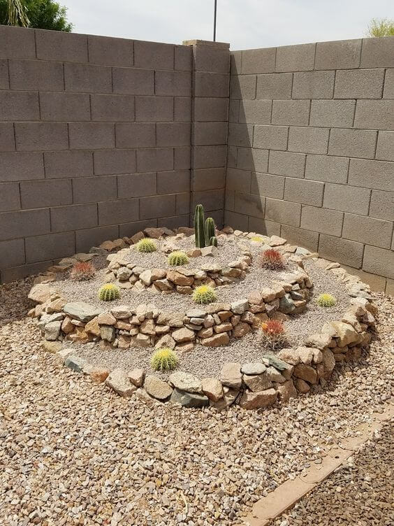 This tiered spiral garden transforms a bare corner into a striking focal point. Layered stone rings rise gently toward the center, where a tall cactus stands like a desert sentinel.
