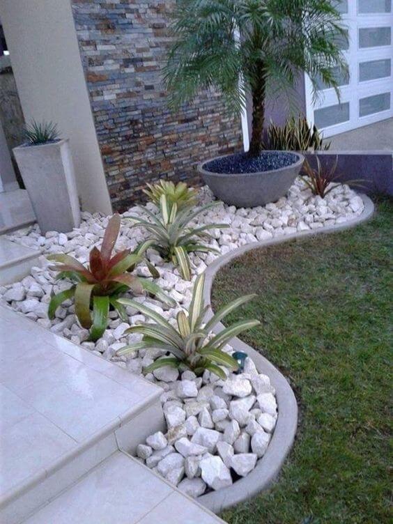 To create this look, outline the area with a curved concrete or stone border to keep the pebbles neatly in place. Choose drought-tolerant plants like bromeliads, succulents, or small palms that stand out against the pale backdrop.
