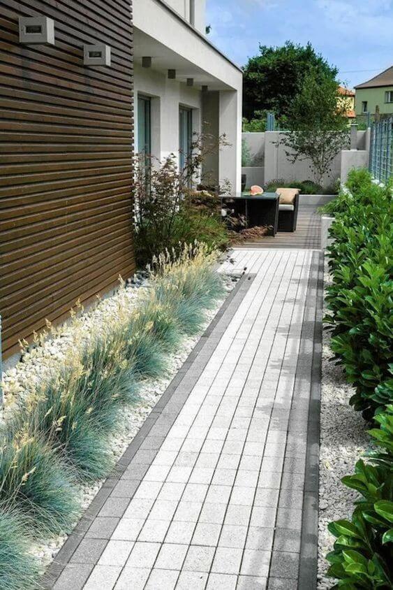 The white stone edging keeps everything neat and polished, while the concrete stepping slabs guide the eye through the space. This blend of modern geometry and natural textures feels both fresh and welcoming.