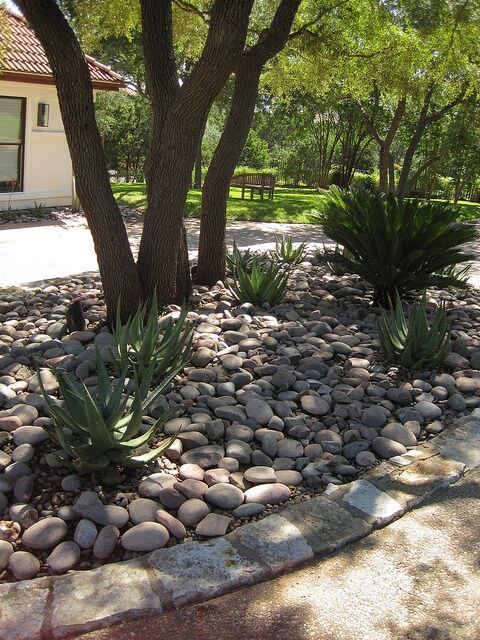 This landscape design transforms the shaded space beneath trees into a striking rock garden. Smooth river stones blanket the ground, providing excellent drainage while also creating a clean, sculptural look.