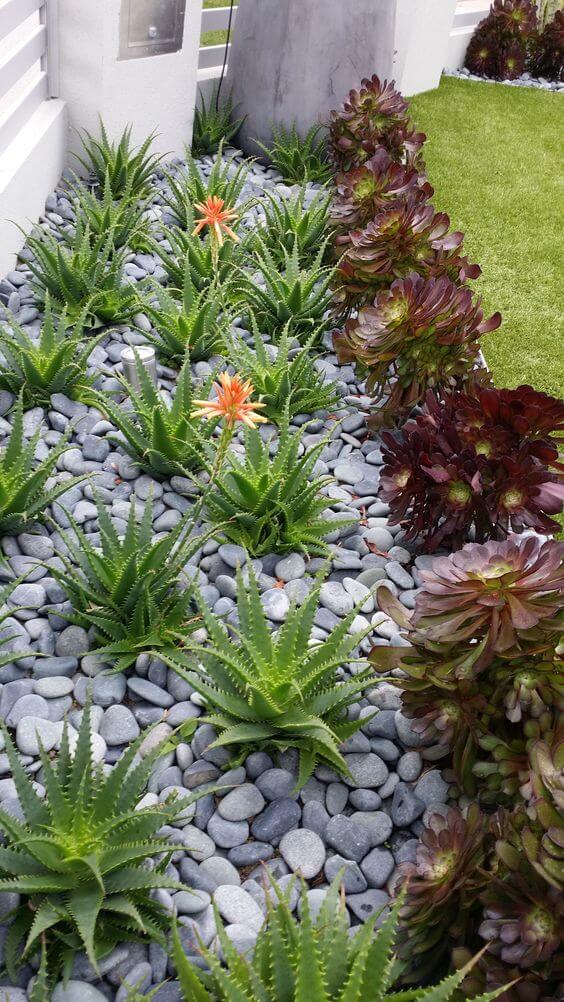 This design combines the sleek look of smooth gray river stones with structured rows of aloe plants, accented by dark burgundy succulents.