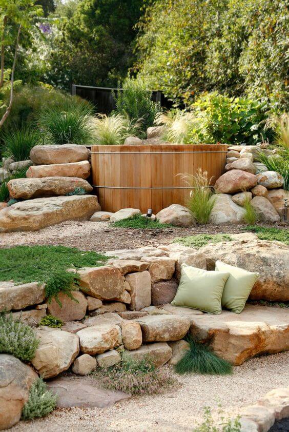 An outdoor hot tub surrounded by natural stone turns your backyard into a retreat. The large rocks frame the tub beautifully, making it blend with the landscape instead of standing out.