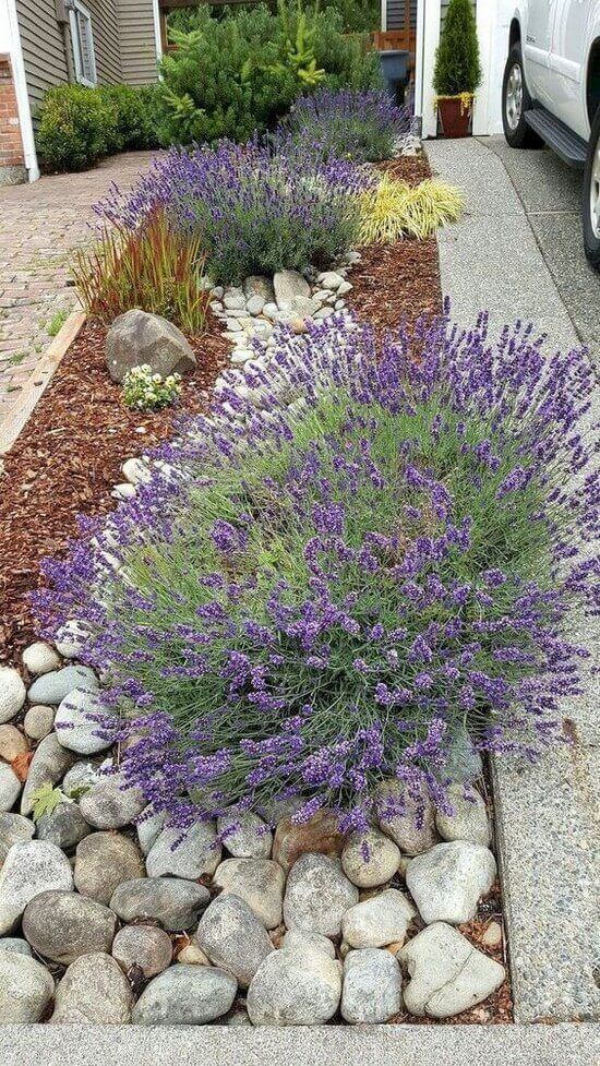 To design this look, choose a narrow strip along your driveway or walkway and line it with medium to large stones. Plant lavender in clusters for a fuller effect, leaving enough space for airflow to keep the plants healthy.
