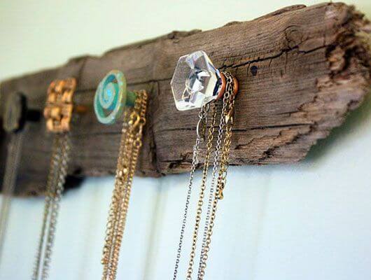 Bring a touch of rustic charm into your room with a driftwood jewelry holder. This idea uses a weathered piece of wood fitted with decorative knobs to create a unique and practical storage solution.