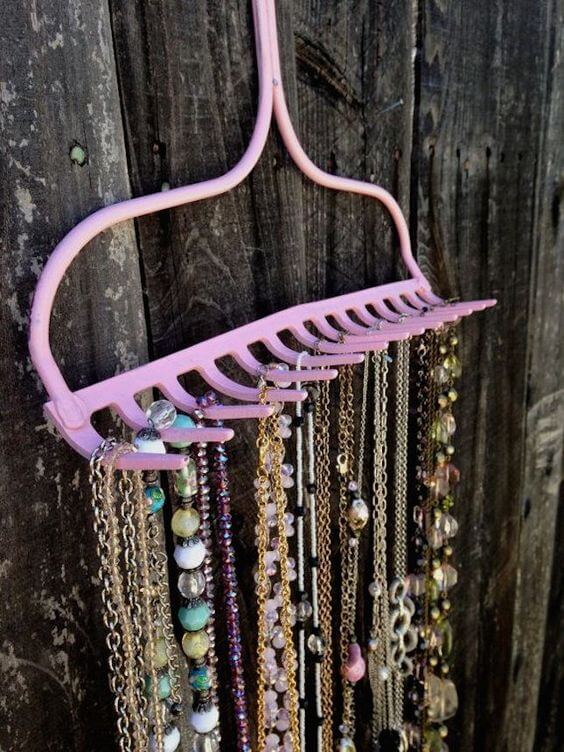 Who knew an old garden rake could make such a stylish jewelry holder? By giving it a fresh coat of paint, you can instantly transform it into a quirky display piece for necklaces and bracelets.