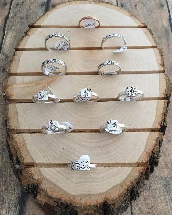 Bring a touch of nature into your jewelry organization with this rustic wood slice ring holder. The natural wooden slab has been neatly cut with several grooves, creating perfect slots to slide in and display your rings.