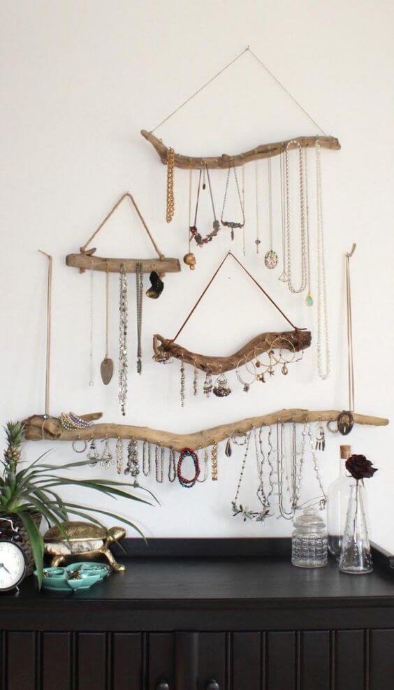 Turn nature into décor with a hanging branch jewelry holder. By suspending driftwood or tree branches on ropes or cords, you create a natural display for necklaces, bracelets, and even earrings.