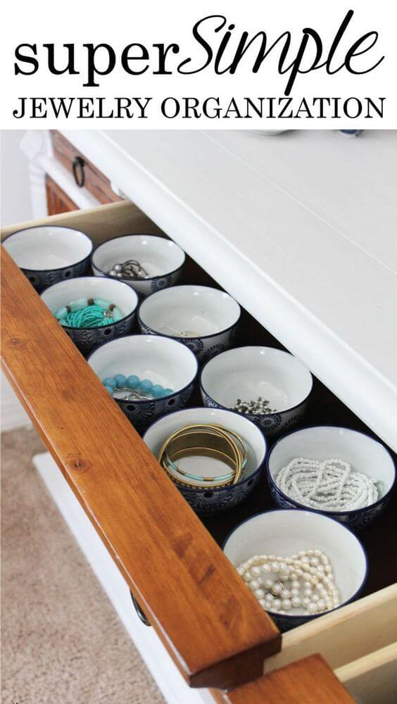 Sometimes the simplest solutions are the most effective, and this tea cup jewelry storage idea proves it. Small bowls or cups placed neatly in a drawer make perfect compartments for different pieces, keeping everything separated and easy to find.