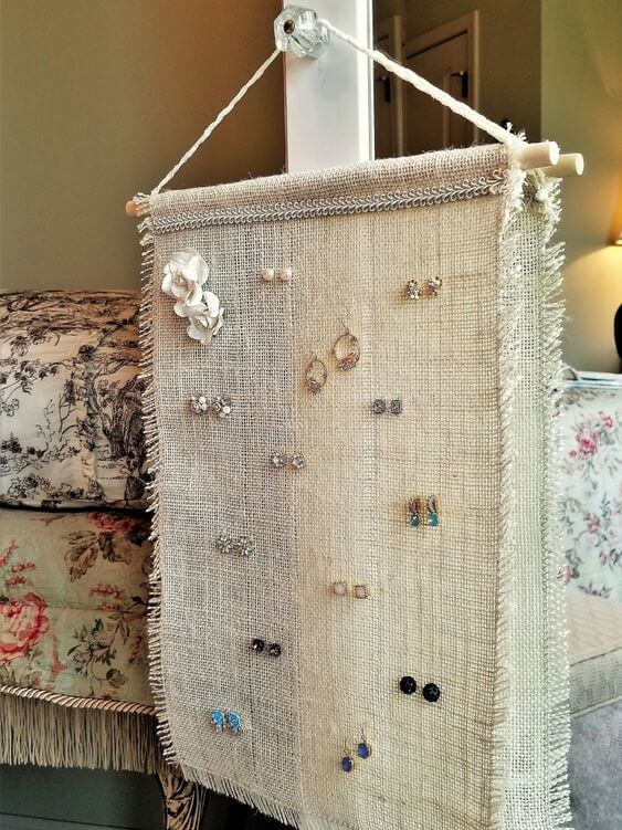 This burlap earring holder is a charming and practical way to display your favorite studs and dangles. The loosely woven fabric makes it easy to slide earring posts through, while the natural texture adds a rustic touch to your space.