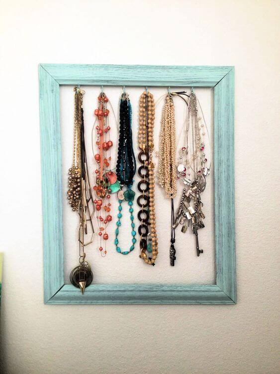 Give an unused picture frame a brand-new purpose by turning it into a jewelry holder. This design keeps everything simple but stylish, with hooks or small nails inside the frame to hang necklaces, chains, and bracelets in an organized way.