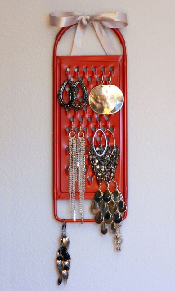 Who knew a simple kitchen tool could become a stylish jewelry organizer? A cheese grater, when painted in a fun color, instantly transforms into a unique earring holder.