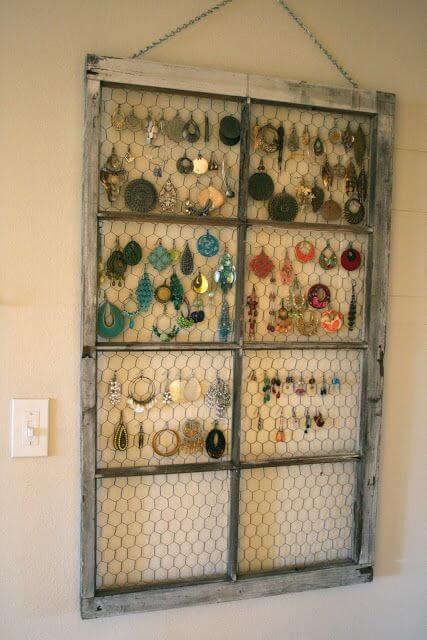If you love rustic charm, this window frame earring hanger is a wonderful way to display your collection. The old frame is fitted with chicken wire, creating plenty of tiny spaces to hook earrings securely.