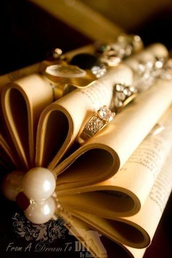 This creative ring organizer turns an old book into a one-of-a-kind jewelry holder. By folding the pages into pleats, the creases create perfect little slots where rings can be tucked securely.