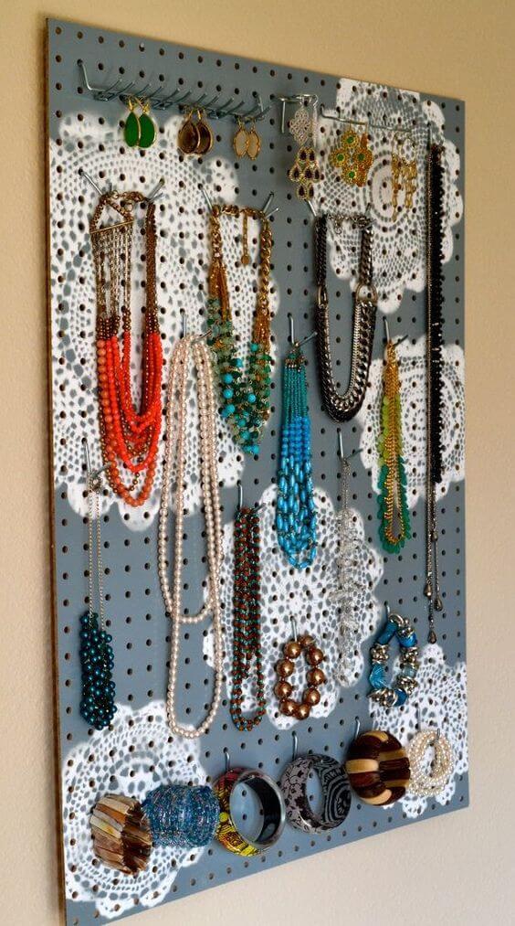 The example here has a fun lace stencil design that adds a touch of personality, but you can decorate it any way you like to match your room décor. Since the hooks can be rearranged anytime, it s perfect if your jewelry collection grows or changes.