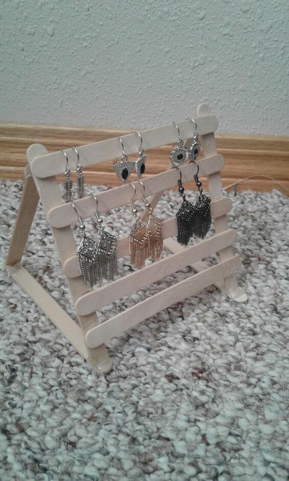 This cute and practical earring holder proves that sometimes the simplest materials can be the most useful. Made entirely from popsicle sticks, it forms a mini easel-style frame with horizontal bars that are perfect for hanging earrings.