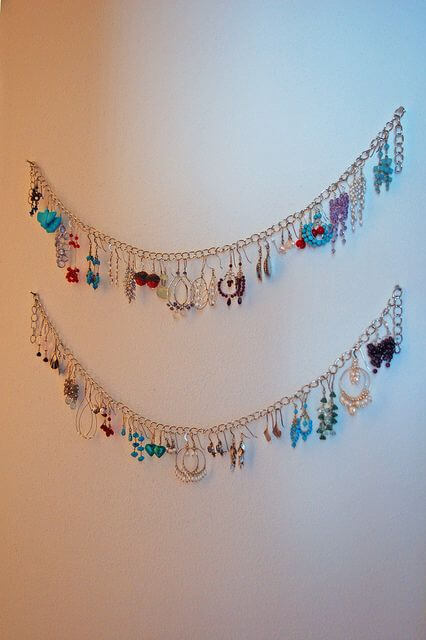 Sometimes the simplest solutions are the most beautiful. This jewelry organizer uses sturdy chains hung in a swooping garland shape to display earrings in a way that is both functional and decorative.