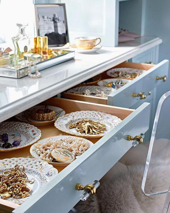 Here s an elegant yet practical way to organize your jewelry collection. This blue dresser features shallow drawers lined with delicate china plates, each holding different pieces of jewelry.