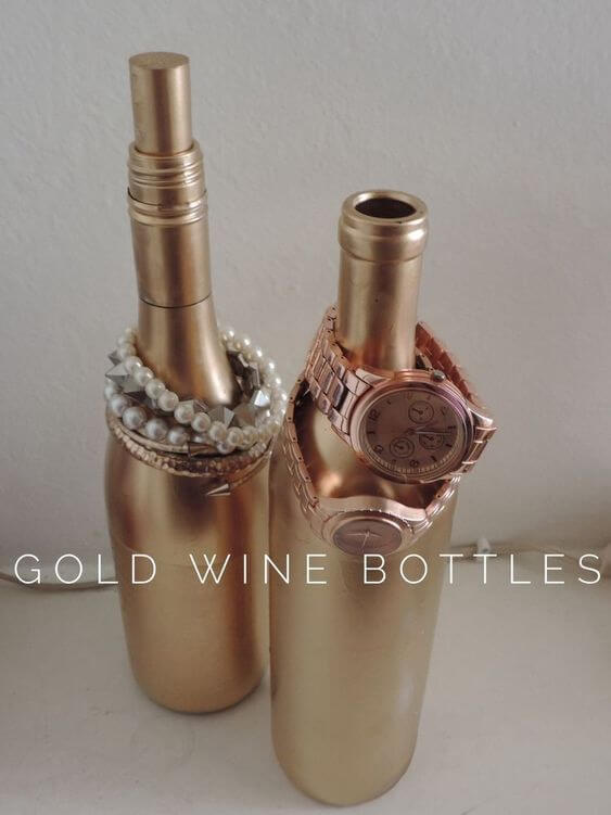 Turn empty wine bottles into stylish jewelry holders with just a bit of spray paint. These bottles are coated in a chic metallic gold, instantly transforming them into glamorous display stands for bracelets, bangles, and watches.
