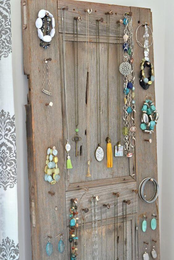 If you love rustic charm, this old door jewelry holder will capture your heart. Instead of letting an old wooden door go to waste, it gets transformed into a full display for necklaces, earrings, and bracelets.