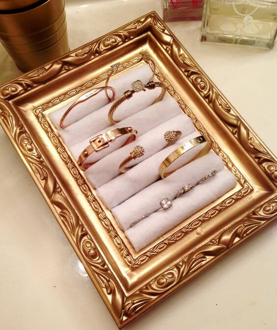 Turn an old picture frame into a chic jewelry display with just a few tweaks. This design uses a gold ornate frame paired with cushioned fabric rolls to hold rings and bracelets securely in place.