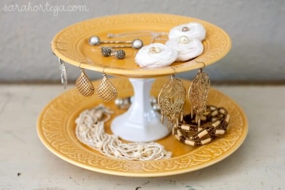 This setup keeps your jewelry visible and easy to grab while doubling as a charming decorative piece on your dresser. You can repurpose old plates and a candlestick holder to create your own stand, making it as colorful or elegant as you like.