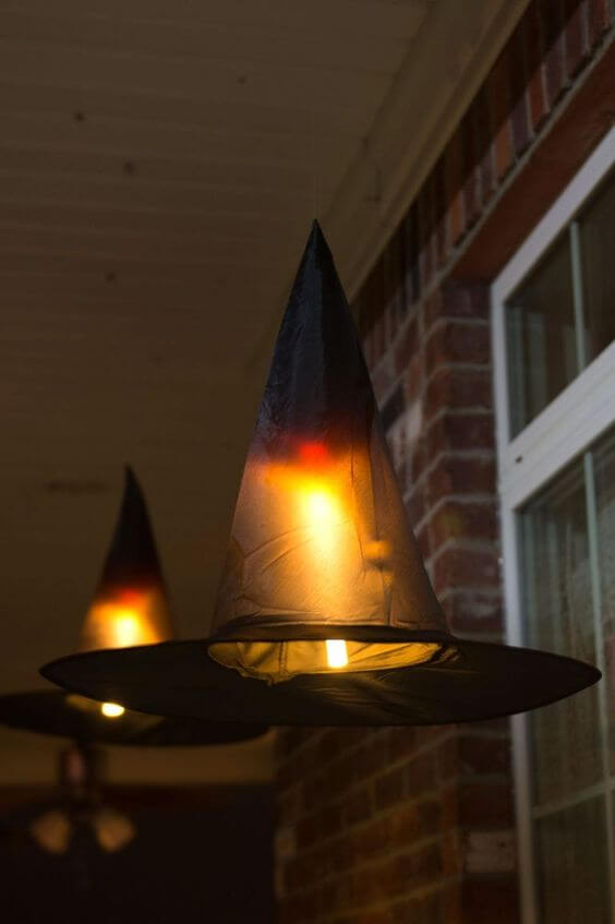 These glowing witch hat lanterns are a spellbinding way to bring a touch of magic to your porch or entryway. The hats dangle eerily in mid-air, lit from within by warm LED lights that create a floating effect once night falls.