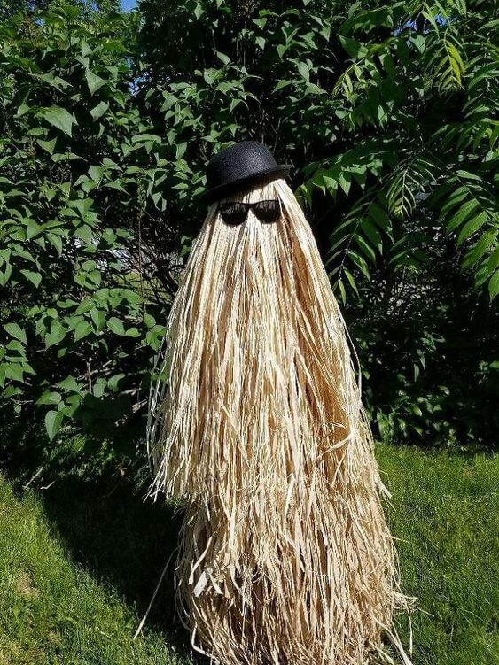 It looks like a DIY âCousin Itâ from The Addams Family, made with raffia, straw, or natural grass skirts to give it that long, shaggy hair effect. Topping it off with dark sunglasses and a black bowler hat instantly brings the character to life in the yard.