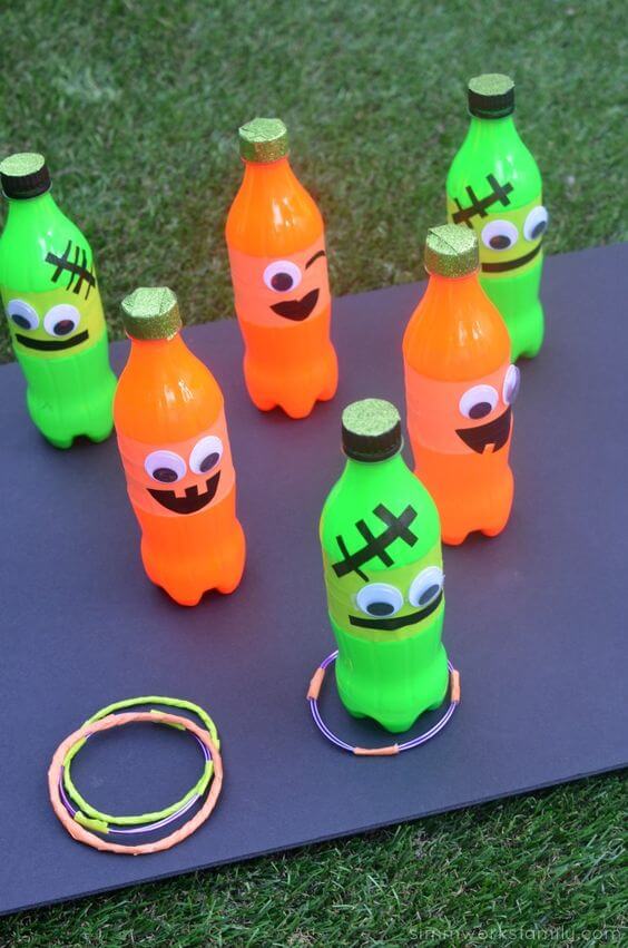 This recycled bottle Halloween monster game is both decoration and entertainment in one. Brightly painted bottles in neon green and orange are turned into silly monsters with googly eyes, marker mouths, and playful designs.