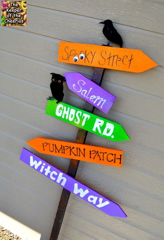 This is a DIY Halloween direction signpost that adds a playful, spooky vibe to your yard or porch. Brightly painted wooden arrows point in different directions with fun names like Spooky Street, Salem, Ghost Rd., Pumpkin Patch, and Witch Way.