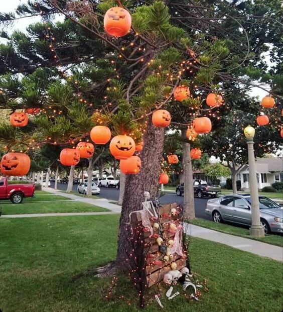 This Halloween tree is a glowing masterpiece that immediately draws attention. Plastic jack-o -lantern buckets are transformed into hanging lanterns, strung up with orange fairy lights to cast an enchanting glow as dusk falls.