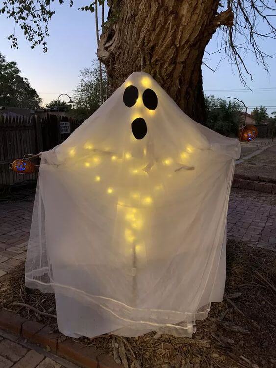 This glowing ghost decoration is such a fun and magical Halloween project! It s made with a simple frame covered in white fabric or sheer tulle, giving the ghost its flowing, haunting shape.