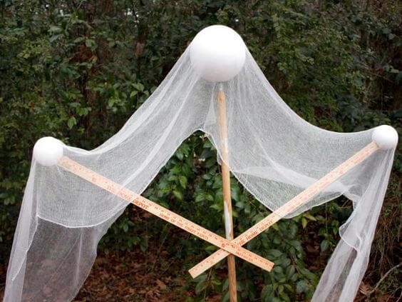 The gauzy material adds an eerie, floating effect that s especially creepy at dusk. To build it, anchor the stakes firmly in the ground, attach the foam heads on top, and drape the fabric so it flows naturally.
