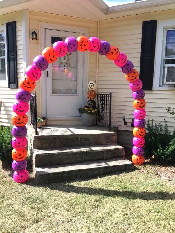 You can use a balloon pump to save time, then secure them with a balloon strip or fishing line to shape the arch. Place it right over your front steps so trick-or-treaters walk under a canopy of smiling pumpkins.